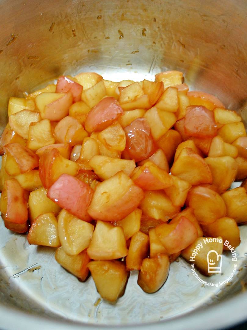 My initially fear of ending up with a pot of burnt apples was rather unfounded. The sugar mixture didn't even stick to the stainless steel pot I used. I have added in lemon zest to cook with the apple fillings even though it is not called for in the recipe I followed. My heart was skipping with joy when the filling was done ;) The cooked apples, lightly accented by the lemon zest, tasted just right...tender but not too soft; sweet but not too sweet. Half the challenge was completed!