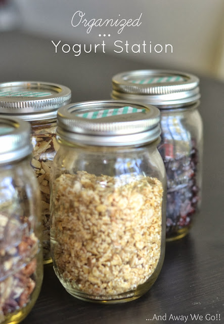 After seeing the breakfast bar in my kitchen (which now includes a quick morning oatmeal), Leanne (Away We Go) emailed me to share something similar she does in her home with yogurt. She created an adorable, functional way to have a healthy yogurt snack with a variety of toppings. It's great to have all these yummy ingredients on hand and easily accessible. Here's Leanne to tell you how she did it.